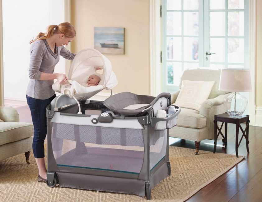 Вы можете выбрать кроватку манеж. Она рассчитана на ребенка от рождения до 3-4 и более лет, много функций. Ребенок первых месяцев жизни практически все время проводит в кроватке — и когда спит, и когда бодрствует; после того, как ребенок немного подрастет, как научится становиться на ножки, дно у кроватки опускается до нижнего уровня и с этого момента она используется не только как кроватка, но и как манежик.