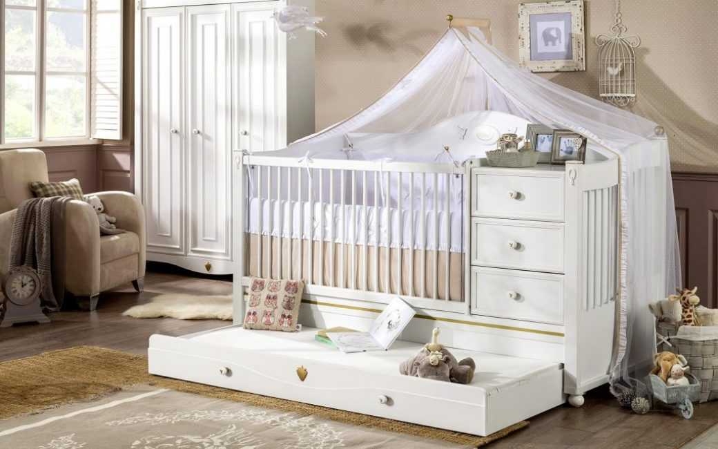 Это – своего рода интерпретация классической модели, которая оснащается дополнительными пристройками. Присоединенный к спальному месту комод – такой вариант, который подойдет и для младенцев и для малышей чуть старше. Часть с комодом – удобное дополнение, позволяющее держать в порядке вещи малыша.