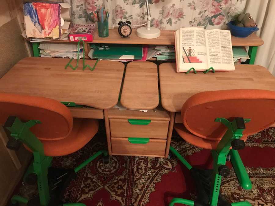 Часто встречаются модели детских столов, рассчитанные на двух детей. Особенно интересно выглядит вариант со столешницей, поделенной на две части, каждая из которых имеет собственную регулировку по высоте. Это удобно для родителей разновозрастных детей.