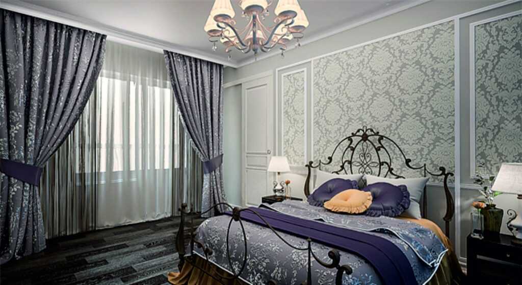 Классический стиль оформления спальни предполагают богатое убранство с позолотой и множеством декоративных элементов. К этому стилю лучше всего подойдёт простая лёгкая вуаль или органза, которая должна только оттенять великолепие тяжёлых бархатных, велюровых или жаккардовых штор. Занавески должны быть лёгкими, на тонкой сетчатой основе, можно с растительными или цветочными орнаментами.