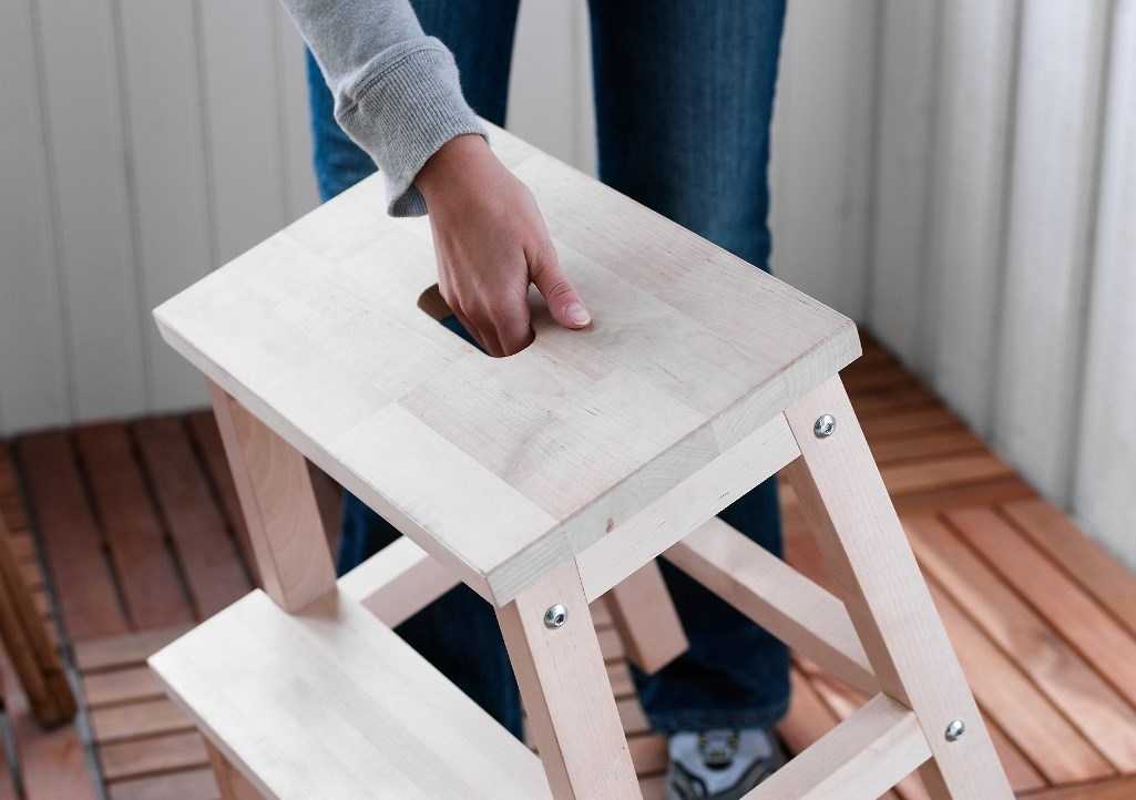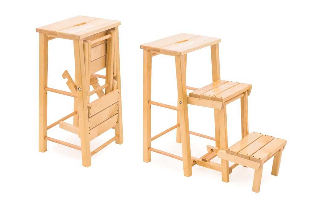 Если квартира имеет выраженный недостаток площади, подойдет складная табуретка-стремянка. Обычно они делаются из дерева и металла, в редких случаях на бюджетных изделиях древесина заменяется МДФ. В разложенном виде табурет принимает форму «Л». Получается, что у мебели имеется 2–3 ступеньки, а также сидение. Фактически у нас имеется короткая лестница.