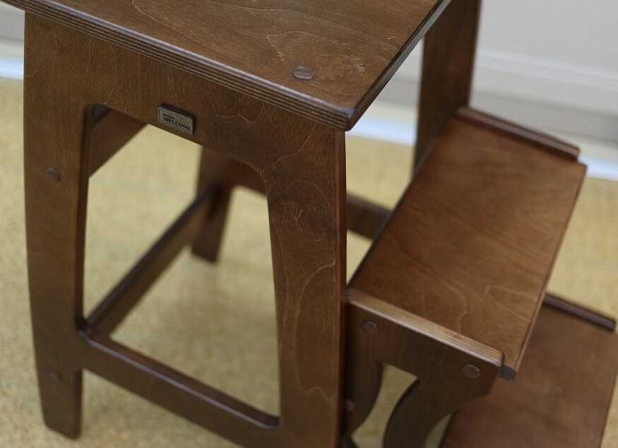 - Стул-трансформер. В сложенном состоянии выглядит, как обычный стул со спинкой для сидения. При трансформации очень устойчив, включает в себя, как правило, 3 ступеньки.