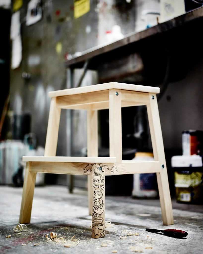 Еще одной распространенной конструкцией можно назвать табурет со ступенькой. В зависимости от модификации ступенек может быть от одной до трех. Отличием подобной табуретки является высота. Часто ее применяют для замены барного стула, также в интерьер удачно вписывают в качестве прикроватного столика.