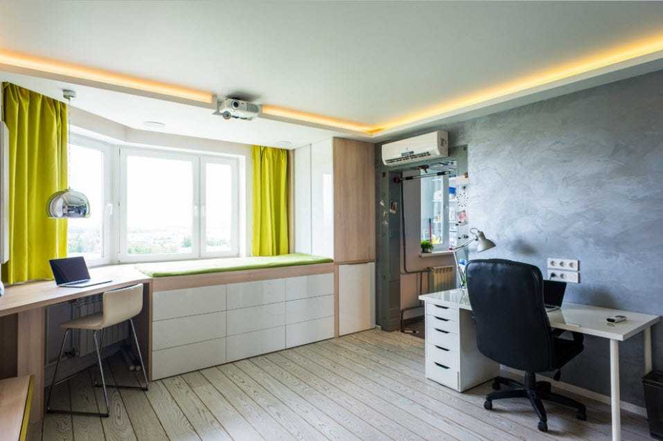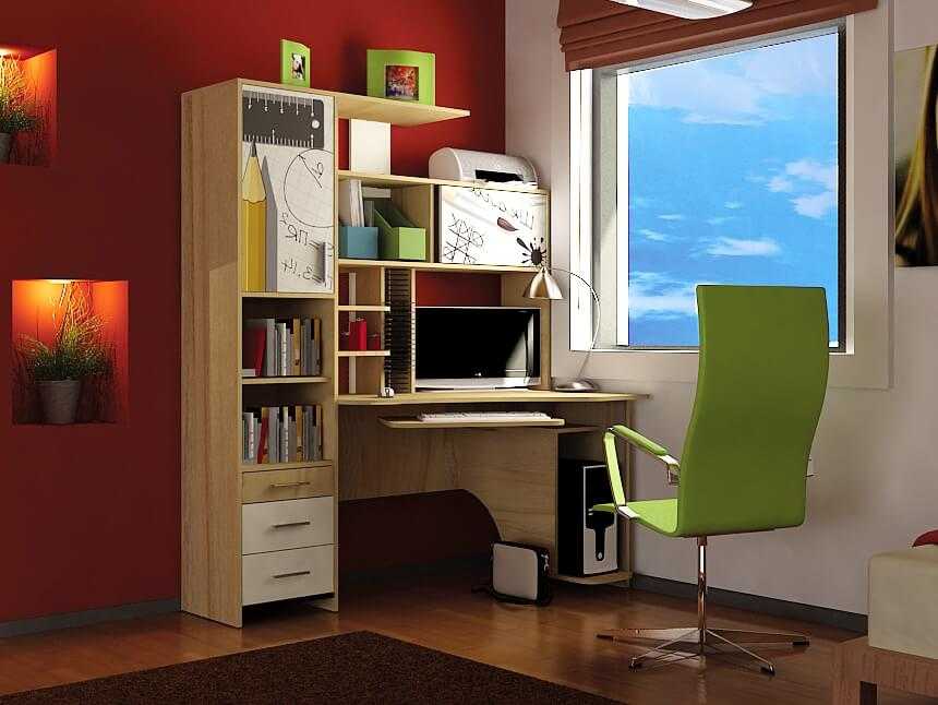 Для подростков рациональным решением станет компьютерный стол у окна. Здесь уместится дополнительная техника, например принтер, помимо этого сохранится функция ученического места. Выдвижная подставка для клавиатуры сэкономит место на рабочей поверхности. Компактной и удобной является угловая форма.