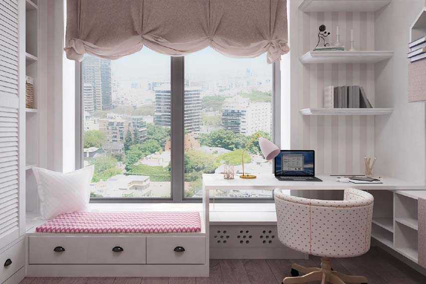 Эта конструкция так же поможет рационально использовать пространство в детской. Длинная столешница послужит альтернативой подоконнику, образуя полноценный письменный стол. Использовать обычный пластиковый подоконник в роли столешницы не стоит. Лучше всего изготовить конструкцию в тон оконной раме.