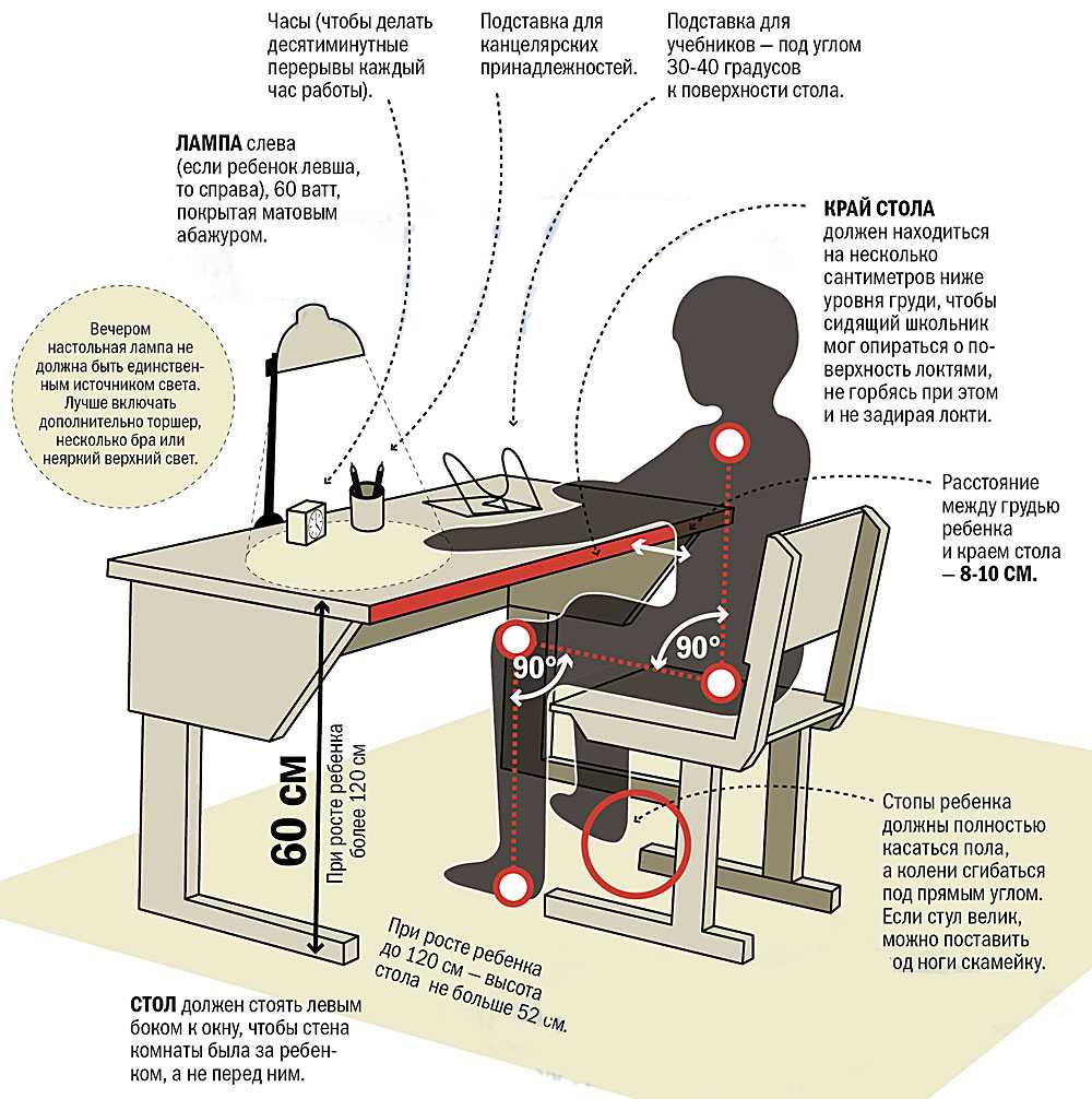 Правильная поза в течение занятий оказывает благотворное влияние на формирование мышечного и костного корсета, поэтому весьма важно следить за осанкой ребенка и подбирать ему мебель подходящего размера. Не забывайте об оптимальном освещении учебной площадки — свет должен располагаться слева