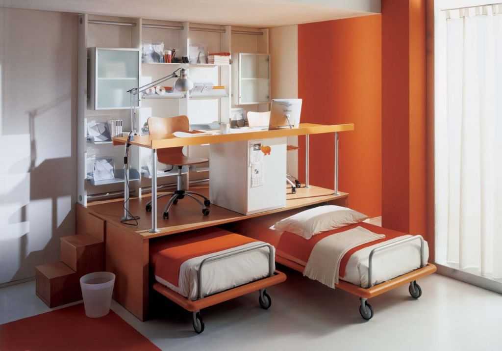 Легко трансформируемые конструкции – отличная альтернатива традиционным кроватям. Тем более, что иногда особенности выдвижной мебели не сильно видны. Особенно актуальной становится видоизменяемая кровать для двоих детей, когда мало места в комнате.