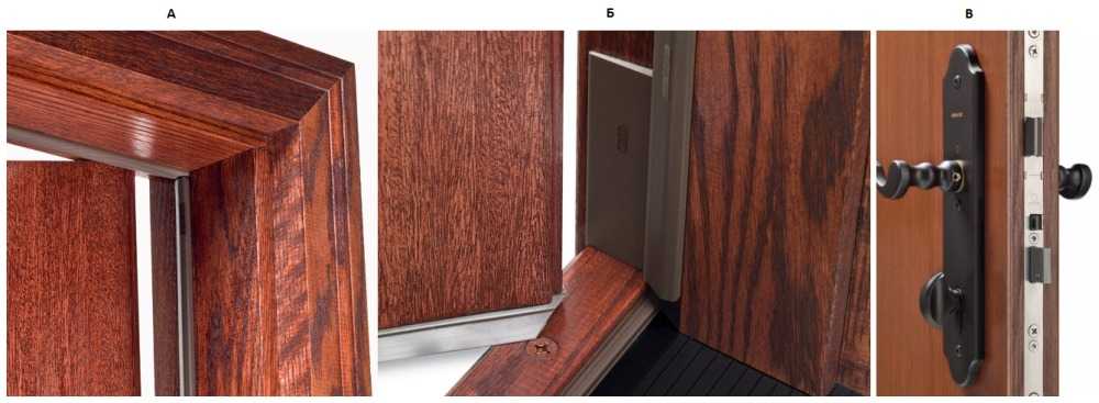 Конструкция современной деревянной входной двери не обходится без телескопических наличников (а), контуров уплотнения (б) и надёжного замка с многоточечным запиранием (в)