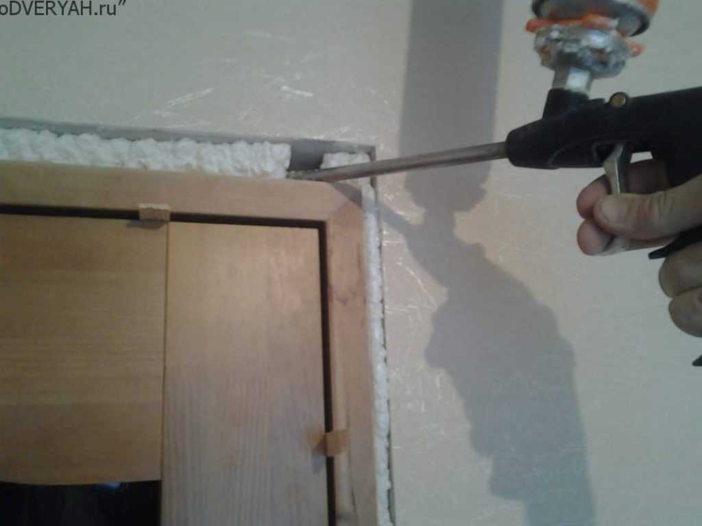 Чтобы обеспечить сохранность геометрической формы установленной конструкции, между планкой и проемом устанавливают распорки из реек. Далее необходимо смочить щель и запенить.
