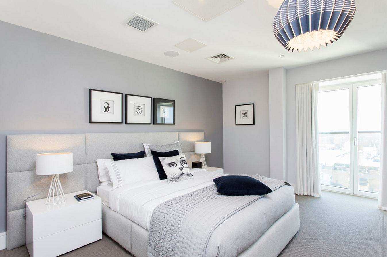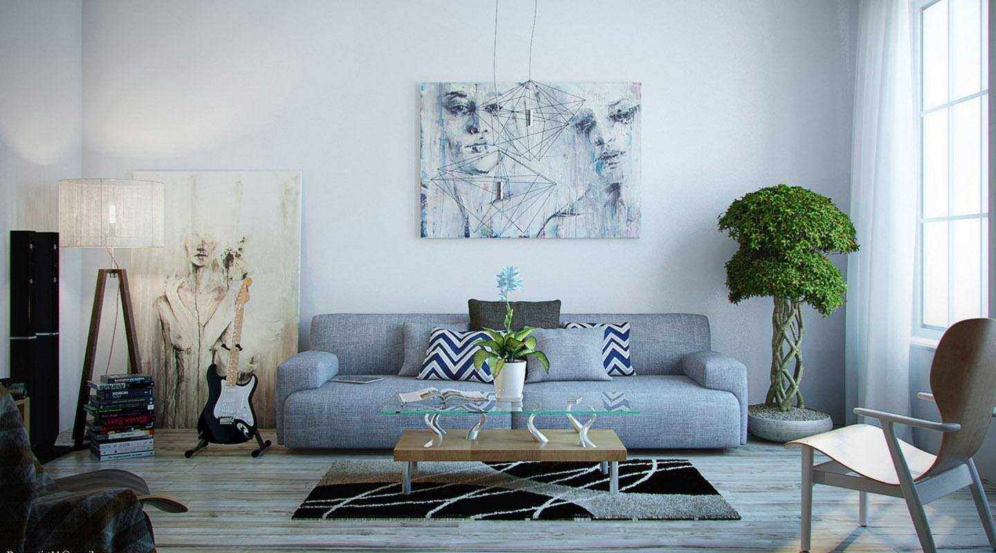 Сочетание серого с голубым придает комнате прохладную атмосферу. Бежевые стены в интерьере придадут пространству ощущение уюта и спокойствия.