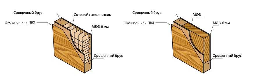 Так, версии с частичным остеклением и глухие двери создают, как правило, на основе массива хвойных пород. Обычно используется сосна. Однако это еще не все. Технология позволяет получить многослойную конструкцию. Поверх массива дерева накладывается плита МДФ с толщиной около 6 мм. Фиксируется она с обеих сторон. Далее профессионалами производится качественная склейка изделия.