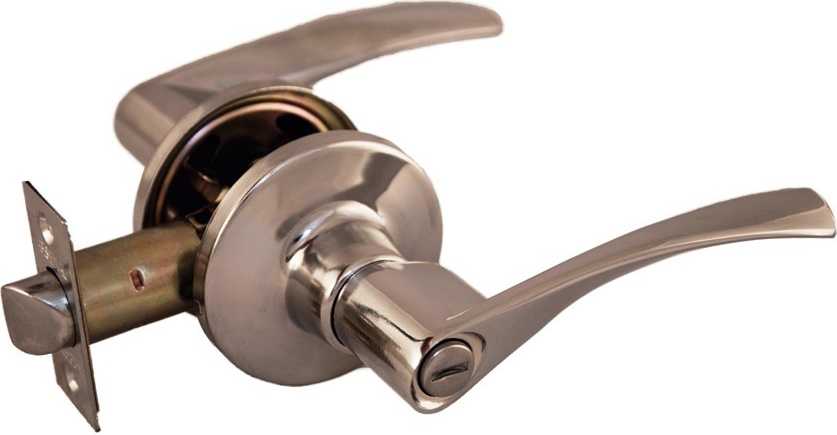 - Нажимные — механизм срабатывает через воздействие на ручку. Происходит скрытие запирающего язычка, дверь открывается.