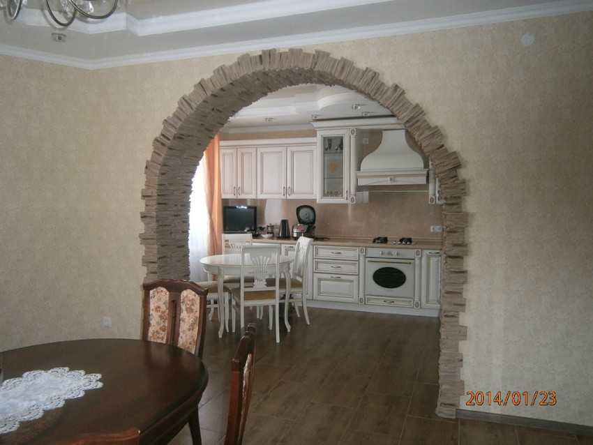 Арочные конструкции будут уместными на кухне. Например, подобное сооружение может дополняться барной стойкой, что актуально при совмещении столовой и кухни. Если помещение выполнено в деревенском стиле, то арку можно разместить над плитой и отделать ее кирпичом либо камнем. В результате получится оригинальная имитация домашнего очага. Подобные решения на фото выглядят очень стильно.