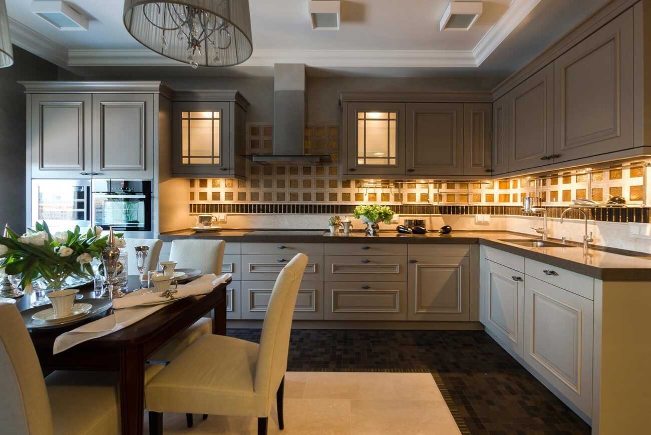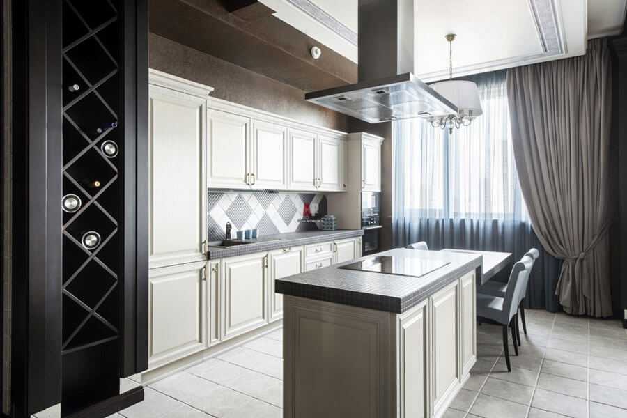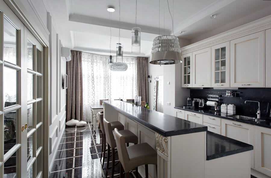 Важно! Неоклассицизм на кухне воплотить гораздо легче, если совместить столовую с гостиной. Ведь неоклассике, напомним, чужды закрытые двери, это стиль анфиладный, распространяющийся на все жилое пространство