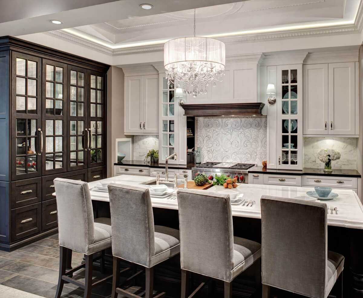 Основное освещение на кухне неоклассического стиля представлено роскошными потолочными люстрами (часто – многоярусными), которые нередко становятся центральным, акцентным элементом помещения. Они могут быть изготовлены из металла, стекла, хрусталя, как на следующем фото. Люстра должна обозначать центр кухни и быть максимально массивной для нее.