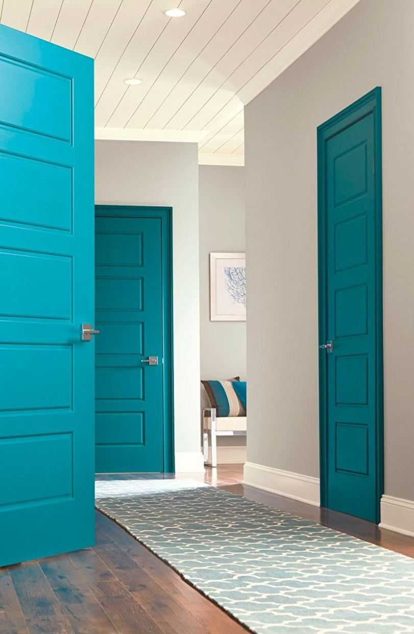 В качестве покрытия для классических межкомнатных дверей выбрали матовую эмаль нежного светло-серого цвета. Этот оттенок нейтрален по своему характеру. Он мягок и ненавязчив, что позволяет сгладить некоторые аспекты интерьеров. Кроме того, такой оттенок прекрасно сочетается со всеми использованными в интерьерах цветами от белого и бежевого до синего и фиолетового.