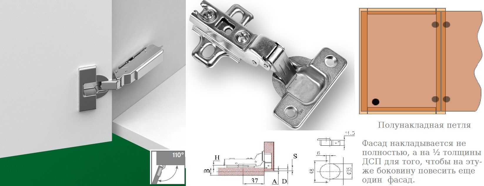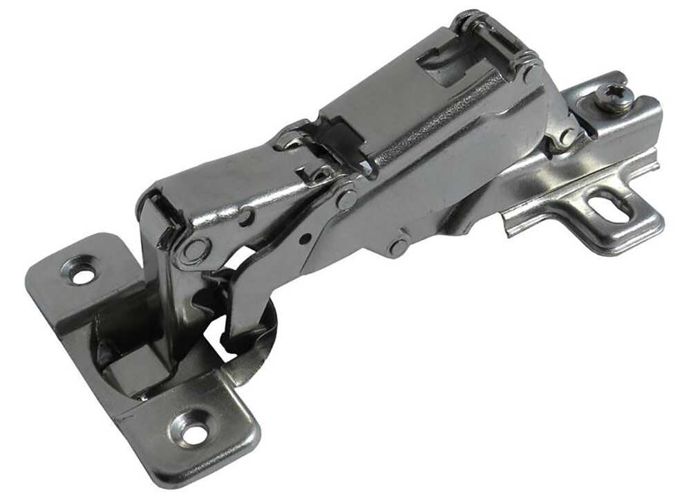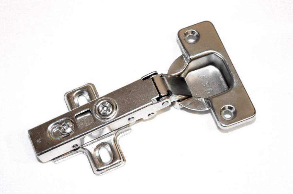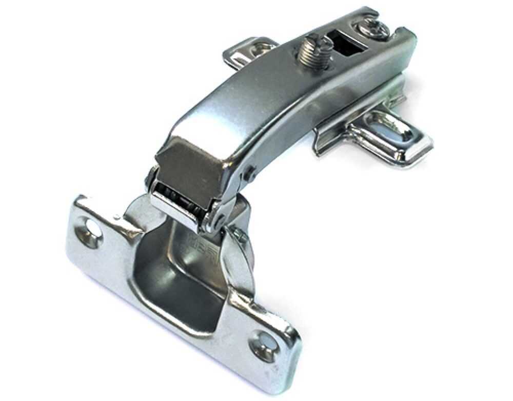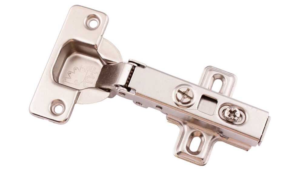 Данный крепеж способен обеспечить дверце открытие, равное 90-165 градусам. Мебельная накладная петля имеет доступную стоимость, благодаря чему является одной из самых применяемых соединений в мебельном производстве. Ее используют на кухонных гарнитурах, комодах для спальни, шкафах и тумбочках.