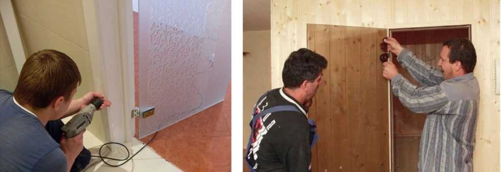 Так как стеклянные двери поставляются в сборе и с коробкой, то их монтаж не должен вызвать затруднений. Самое главное – не уронить тяжелое полотно и правильно установить короб, используя уровень.