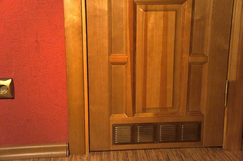 Существуют двери с вентиляционной решеткой и кольцами. В первом случае внизу полотна вырезают проем по форме изделия и закрывают пластиковой, металлической или деревянной решеткой. К преимуществам таких конструкций относят: