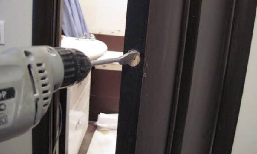 Держите сверло строго перпендикулярно двери, иначе в дальнейшем защелка может стать наискось и её будет заедать при работе.