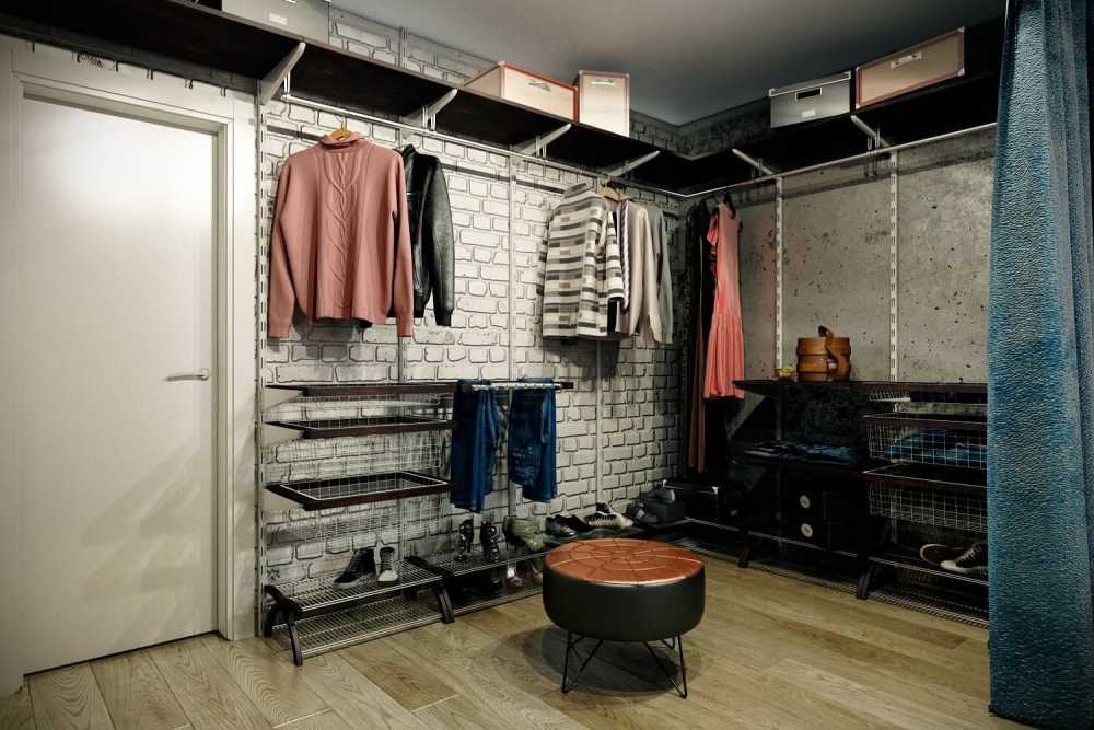 Современная гардеробная в стиле лофт отделяется от комнаты плотными шторами.