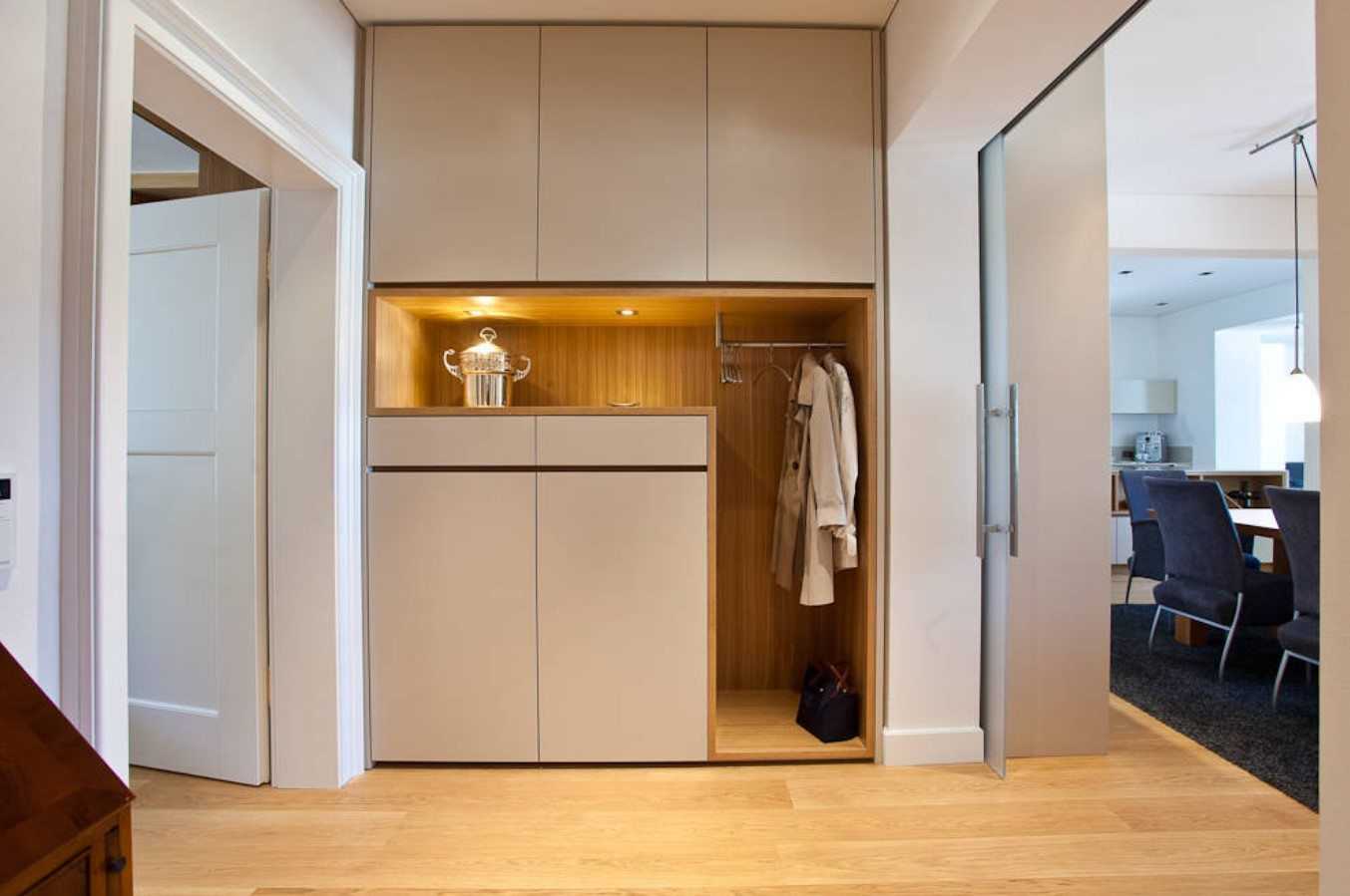Шкафы купе бывают трех видов. Встроенные отличаются тем, что они занимают какую-то нишу и не имеют собственных стен, пола и потолка. Аналогичную конструкцию делают и тогда, когда можно отгородить часть помещения от стены до стены. В таком случае просто заказывают фасад (двери) для шкафа купе с системой роликов и направляющими. Внутри ставят перегородки и крепят/устанавливают начинку. В некоторых прихожих встроенный шкаф купе делают на месте бывшей кладовки, при другой планировке удается отгородить часть в торце.