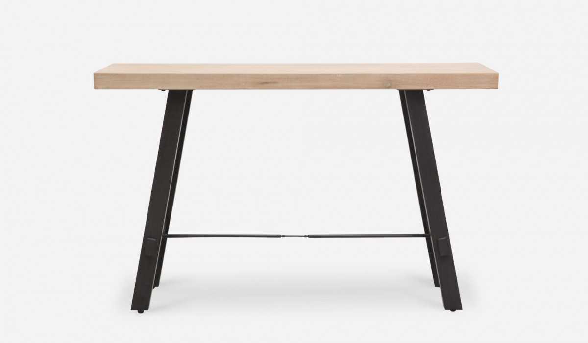 Столешница вырезается из доски, имеющей толщину не менее 4 см. Изделию можно придать любую форму. Далее ножки прикручиваются к столешнице с помощью винтов. Отверстия следует закрыть заглушками. Готовая консоль покрывается лаком или краской. Конструкцию часто дополняют полкой из дерева или стекла, что расширяет ее функциональные возможности.