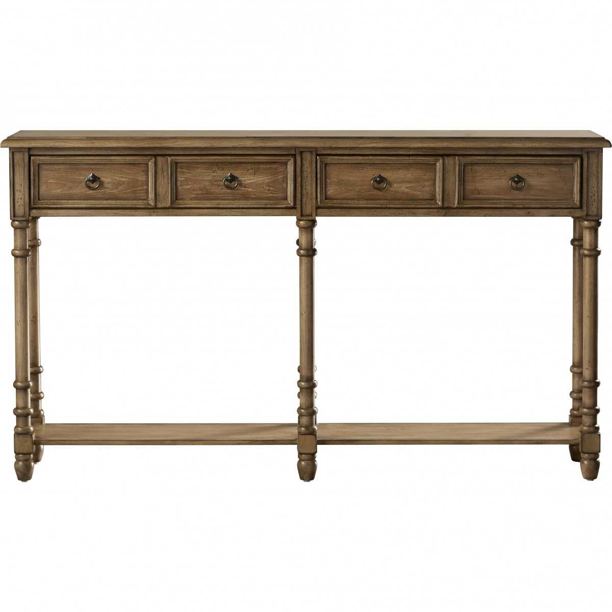 Лаконичный консольный столик с выдвижными ящиками, расположенными под столешницей, удобно использовать даже в качестве небольшого письменного стола.