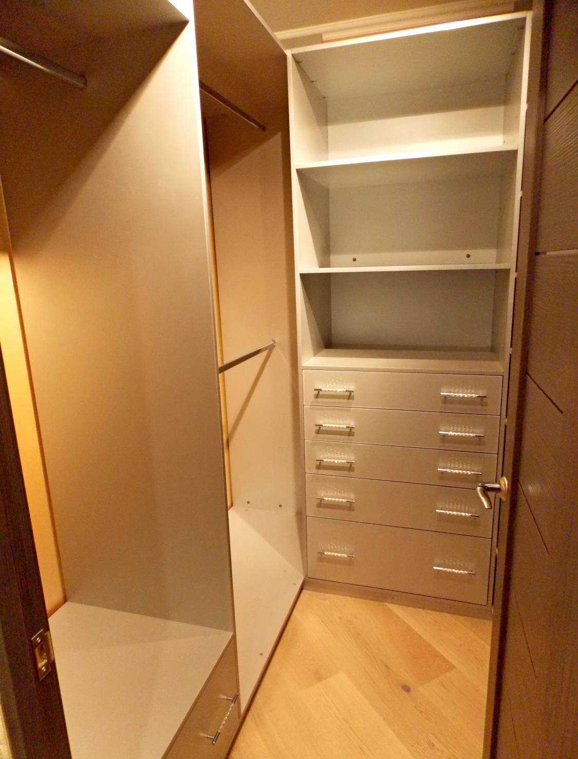 От массивных комодов в маленьком помещении лучше отказаться в пользу выдвижных ящиков, встроенных в общую систему хранения. Но при размещении шкафов вдоль обоих длинных стен, возле короткой можно поставить неглубокий комодик (только проследите, чтобы он не мешал доставать вещи из углов).