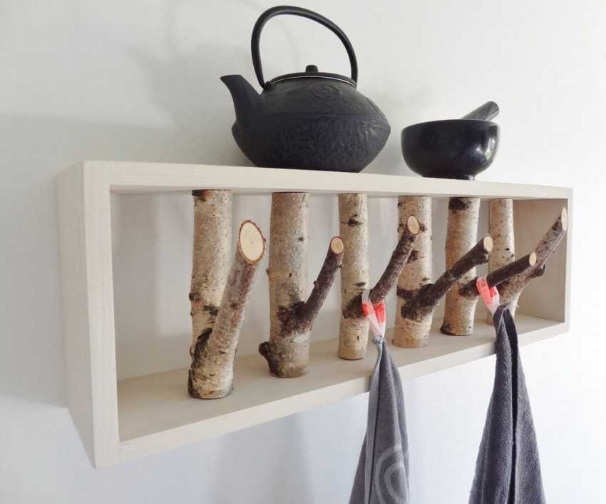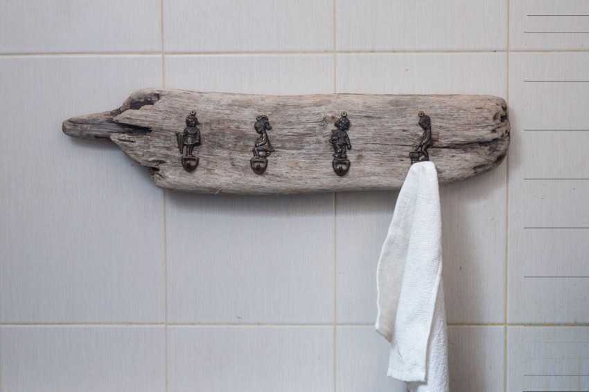 Комбинированные модели представляют собой, например, основу из дерева в сочетании со стеклянными полками и металлическими крючками. Или сочетание метала и пластика. Иногда используют другие природные материалы – коряги причудливых форм, которые пропитывают специальными растворами, предотвращающими гниение и уберегающими от воздействия влаги. Такие элементы могут крепиться к стене с помощью кожаных ремней или металлических колец. Выглядят эти композиции очень эффектно.