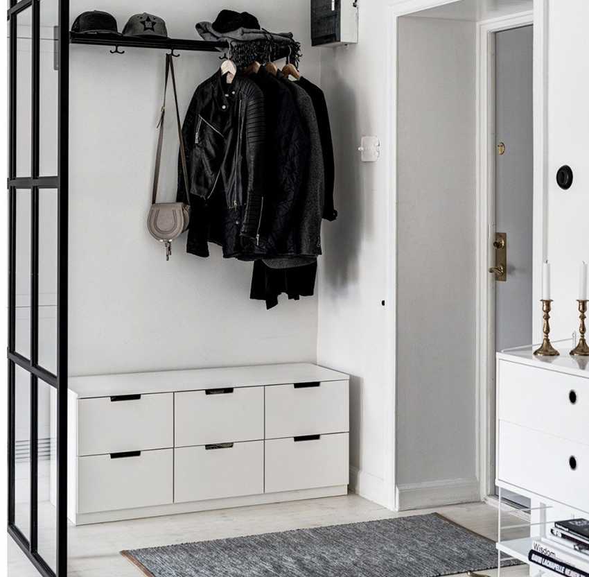 При этом важно учесть в каком направлении открывается дверь, чтоб подобный вариант размещения не доставил дискомфорт. Также при входе часто размещают открытые либо закрытые шкафы для обуви