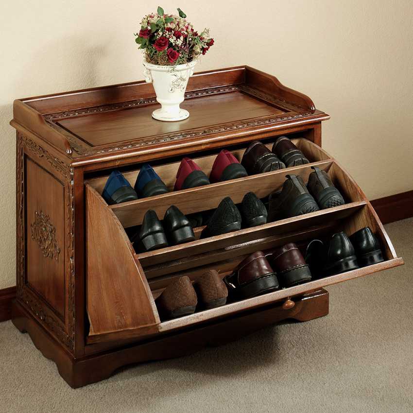 Дверцы обувницы устроены по такому принципу, что имею один или несколько выдвижных ящика. Открывается дверь — ящик сам выдвигается наружу. Расположение кассет может быть вертикальным или горизонтальным. Такие обувницы почти занимают места, но достаточно вместительны и позволяют хранить высокую обувь, поскольку все пары находятся в вертикальном положении. Такая тумба под обувь с сиденьем отлично подходит для прихожих, где не хватает пространства для более габаритных вариантов.