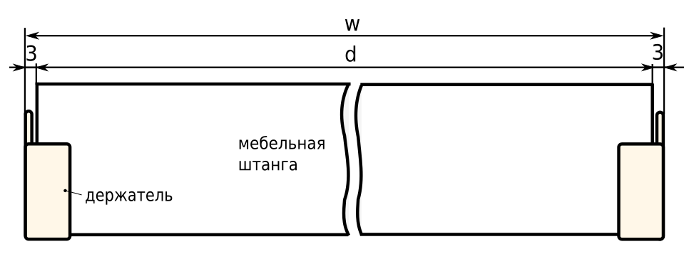 - Измерьте расстояние от стенки до стенки (w), от полученного числа отнимите сумму расстояний до держателя. Получится длина штанги (d).