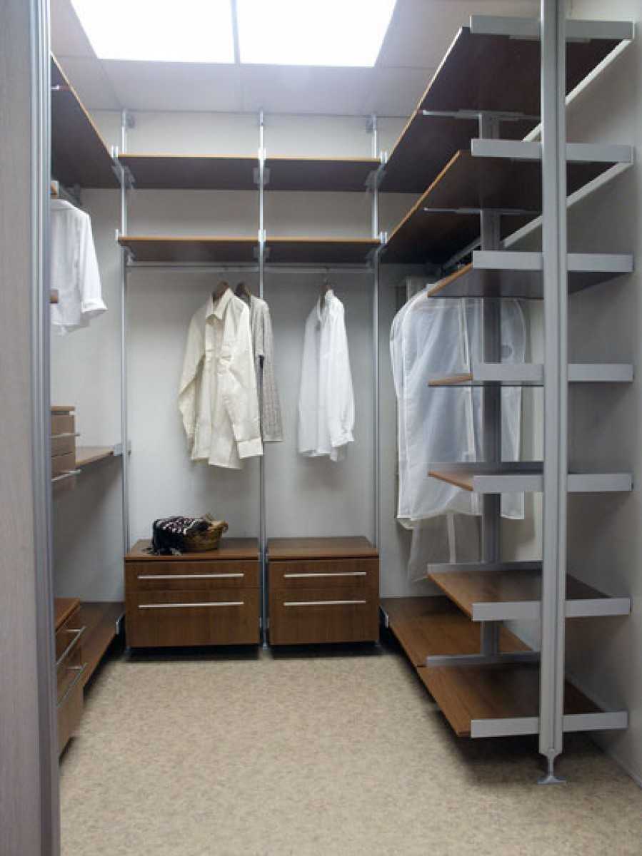 В условиях узкой гардеробной можно установить металлические конструкции с деревянными полками на всех стенах от пола до потолка. Нижний ярус центральных полок дополняется маленькими деревянными ящиками. Такие конструкции будут гармонично смотреться на фоне бежевого или кремового пола, светло-серых или белых стен, а также светлого потолка с ярким освещением.