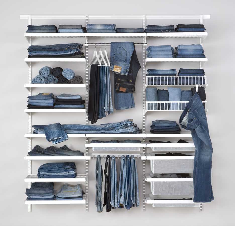 - Джинсы. Для любителей этого вечно модного и удобного предмета одежды стеллаж будет просто необходим. Джинсовая ткань практически не мнется, поэтому складывание для джинсы не пойдет во вред,