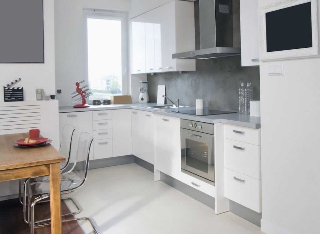 Белоснежные фасады кухни и серая столешница лучше всего смешиваются с такими альтернативами дизайна: