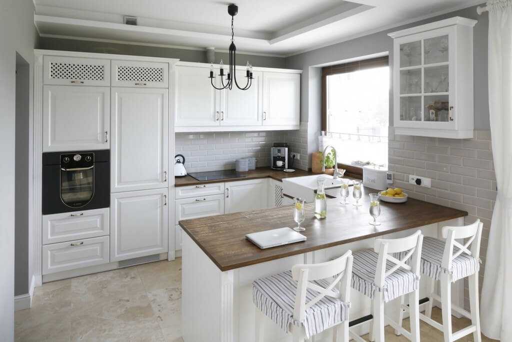 Современное прочтение белой кухни в стиле прованс с деревянной коричневой столешницей