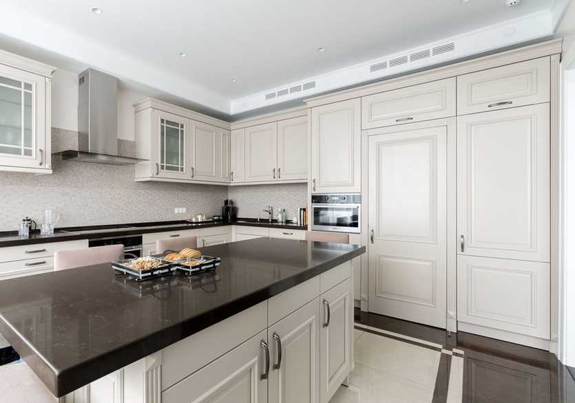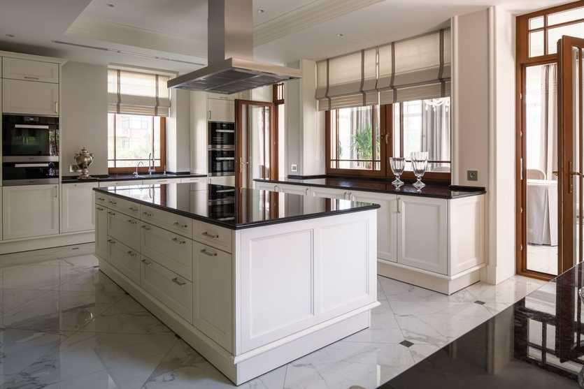 Не стоит беспокоиться, что в кухне с опасным микроклиматом придется отказаться от эстетики. Современные материалы, которые можно использовать в неоклассике, отлично справятся с высокими температурами, влажностью и всеми видами загрязнений. Это может быть керамическая плитка и керамогранит в качестве облицовки стен, близко расположенных к рабочей зоне, моющиеся обои и сидения с кожаной обивкой.