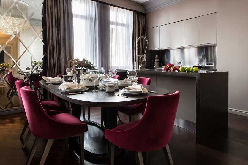 Идеально подойдет П-образный или параллельный кухонный гарнитур, выкрашенный в светлые оттенки, но более компактные модели тоже будут смотреться уместно. Чтобы не перегрузить интерьер декором, можно приобрести несколько шкафов с застекленными фасадами, демонстрирующими красивый сервиз. Если площадь позволяет, следует выделить для столовой отдельную комнату.