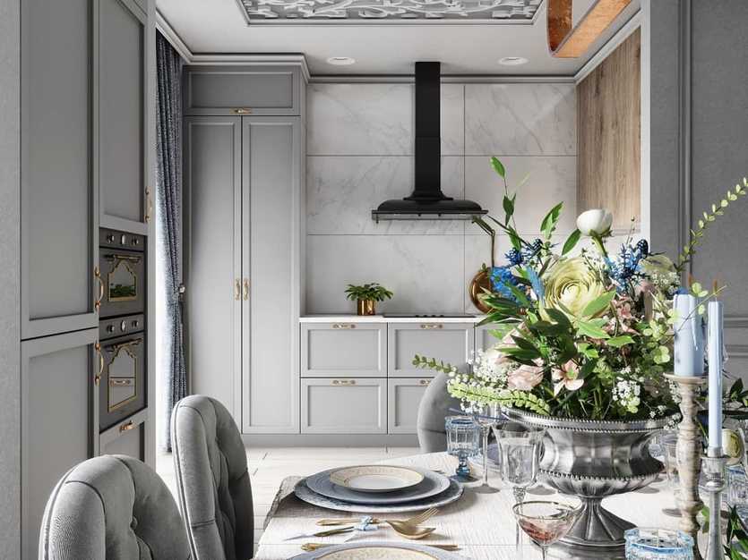 Если вы оформляете кухню-столовую или кухню-гостиную в стиле неоклассика, стоит позаботиться о зонировании. Кстати, для кухни-гостиной неоклассика — более удачный выбор, чем традиционно-классическая стилистика.