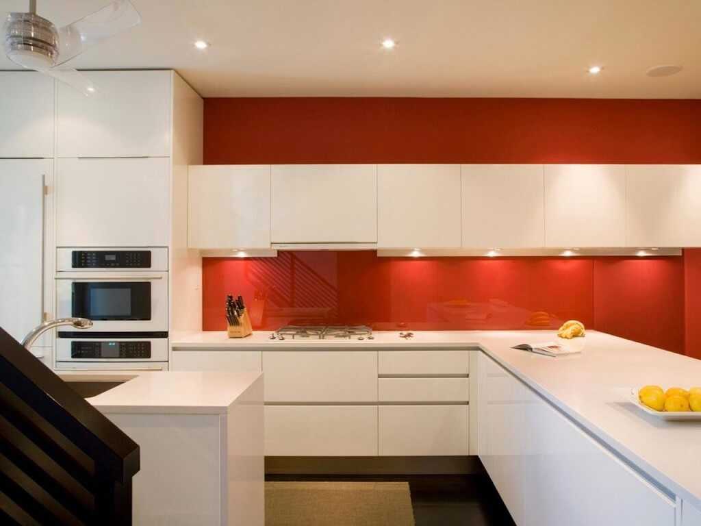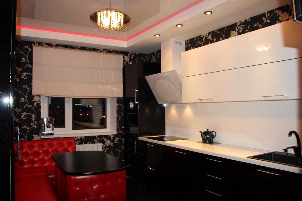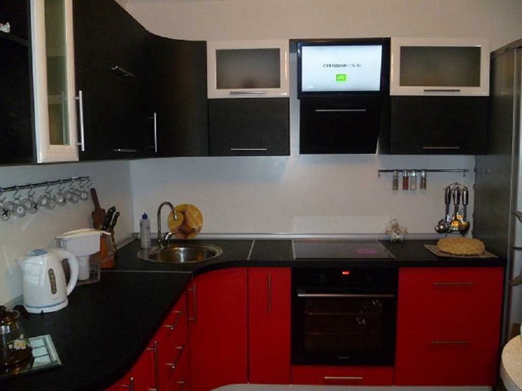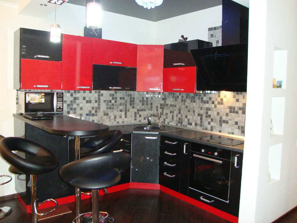 В красно-черных тонах следует сделать фасады гарнитура, а белый оттенок будет служить для них идеальным фоном. Что касается стиля интерьера, то он должен быть современным.
