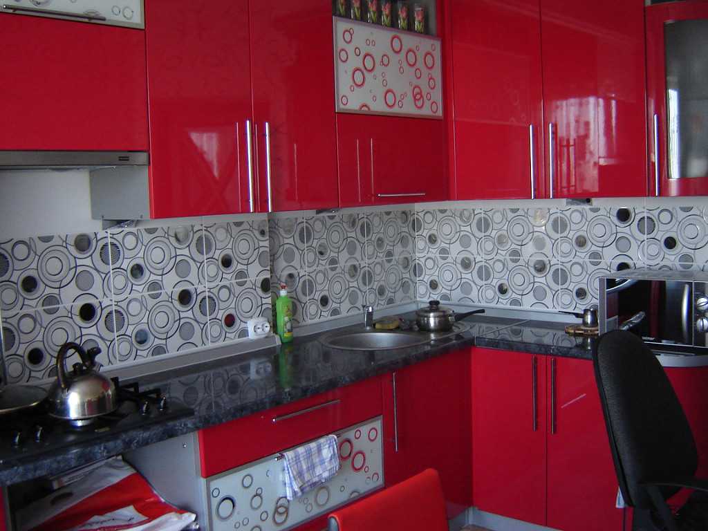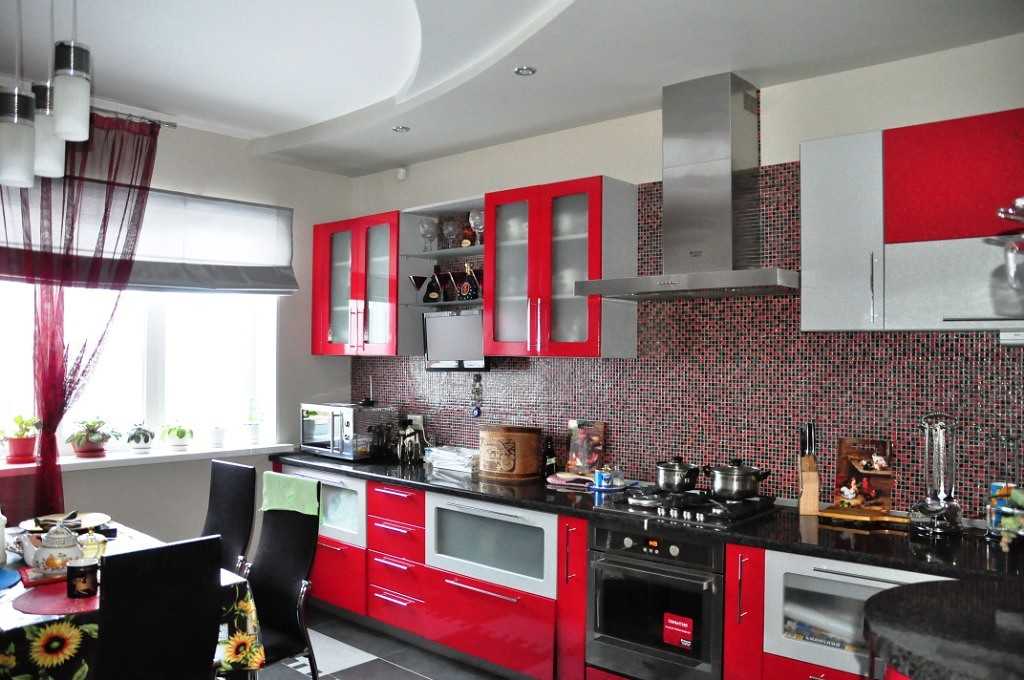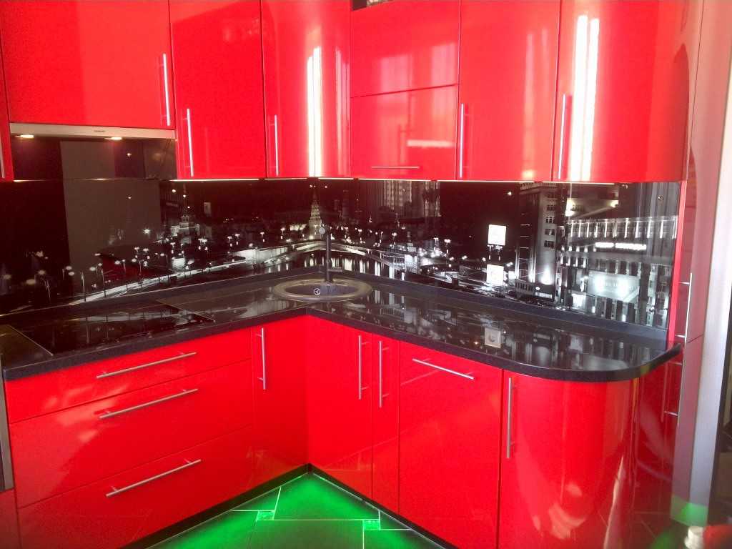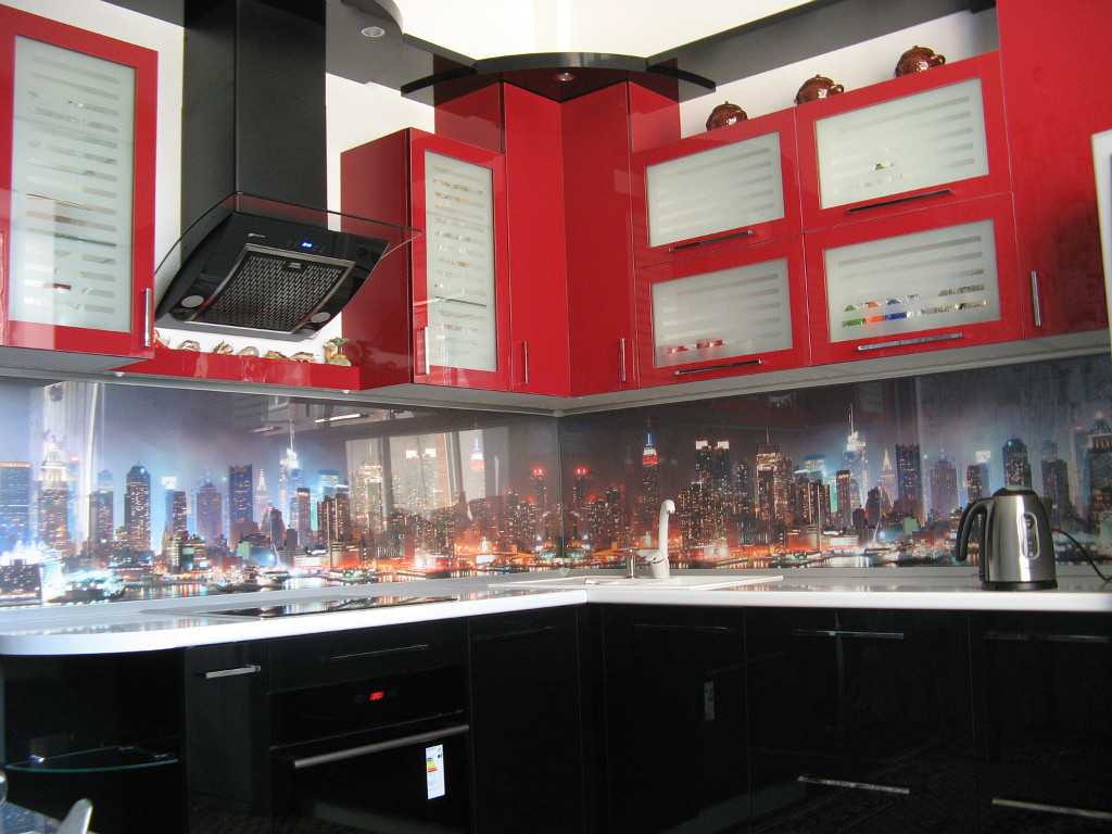 Поверхности фасадов могут быть глянцевыми, в роли аксессуаров выступает металлическая фурнитура и стеклянные элементы. Чтобы гарнитур выглядел более интересно, рекомендуется обустроить кухонный фартук, используя керамическую или стеклянную мозаику в черном, красном и сером цвете. Неплохо будет выглядеть фартук из закаленного стекла с красно-черной фотопечатью.
