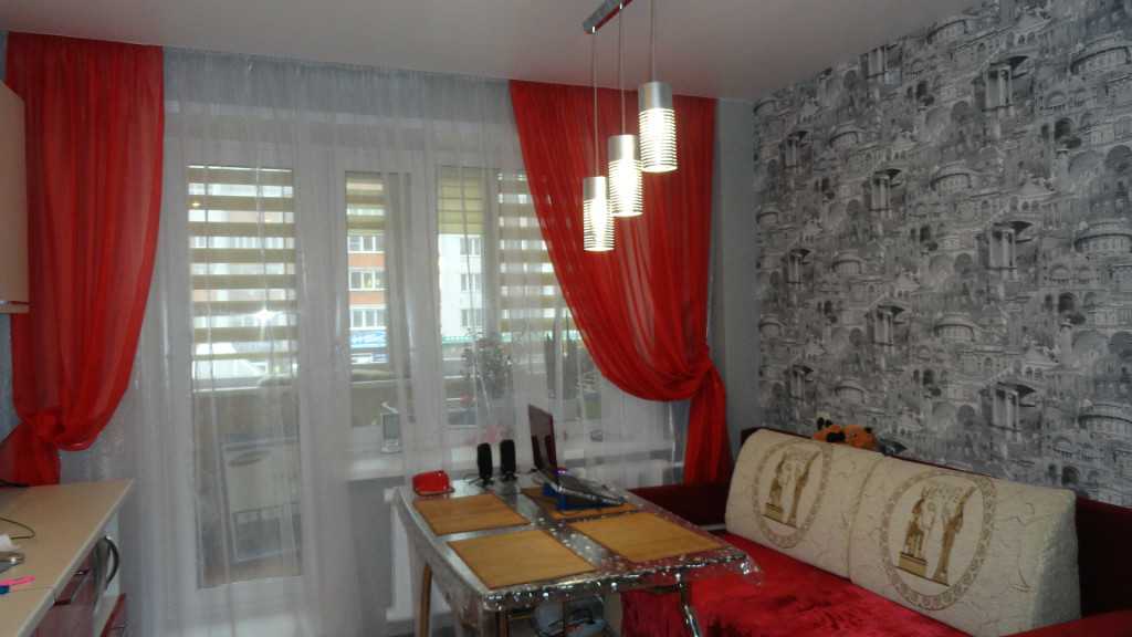 Выбор штор для такой кухни зависит от разных факторов: выбранного стиля интерьера, размеров помещения, степени его освещенности и так далее. Если кухня просторная, с большими панорамными окнами, и выполнена в классическом стиле, можно использовать длинные плотные шторы глубокого красного, но не яркого, а приглушенного, цвета. Перевязать их можно черной или серой атласной лентой.