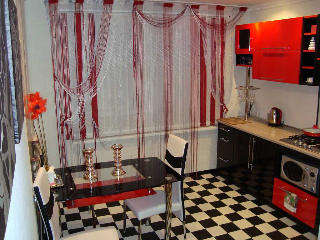 Для черно-красной кухни, обустроенной в стилях кантри, деревенский или шебби-шик, лучше всего использовать легкие шторы или короткие занавески в черно-красную клетку. Для кухни, выполненной в современных стилях, дизайнеры советуют подобрать аккуратные жалюзи, либо лаконичные римские шторки.