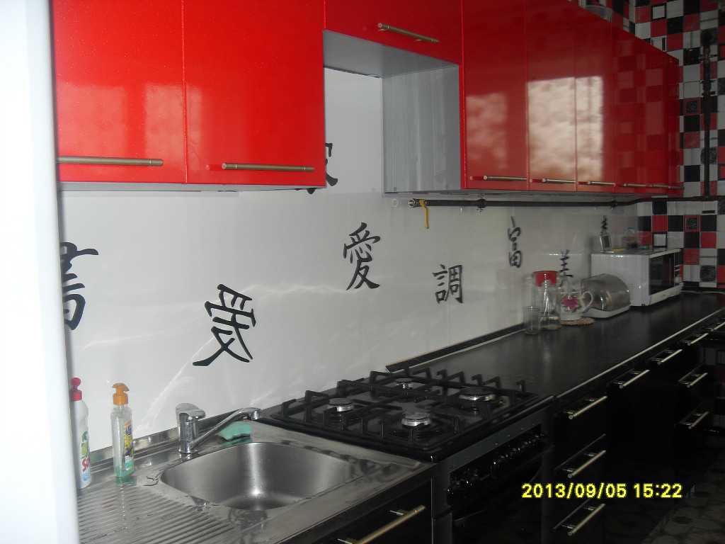 Например, обустроить фартук в черно-синих тонах, повесить на окна синие шторы, расставить на открытых полках декоративную посуду синего цвета.Красно-черный гарнитур необходимо дополнить черным обеденным столом с красными стульями. Стены лучше сделать серыми, пол может быть черным наливным.