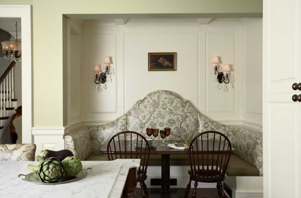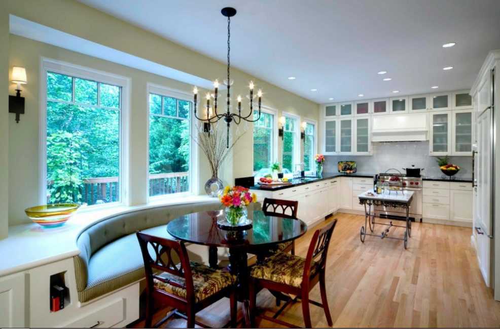 Если на кухне есть эркерная стена, можно приобрести диван, подстраивающийся под ее геометрию. Правда, их проще изготовить на заказ, чем искать товар с подходящими размерами.
