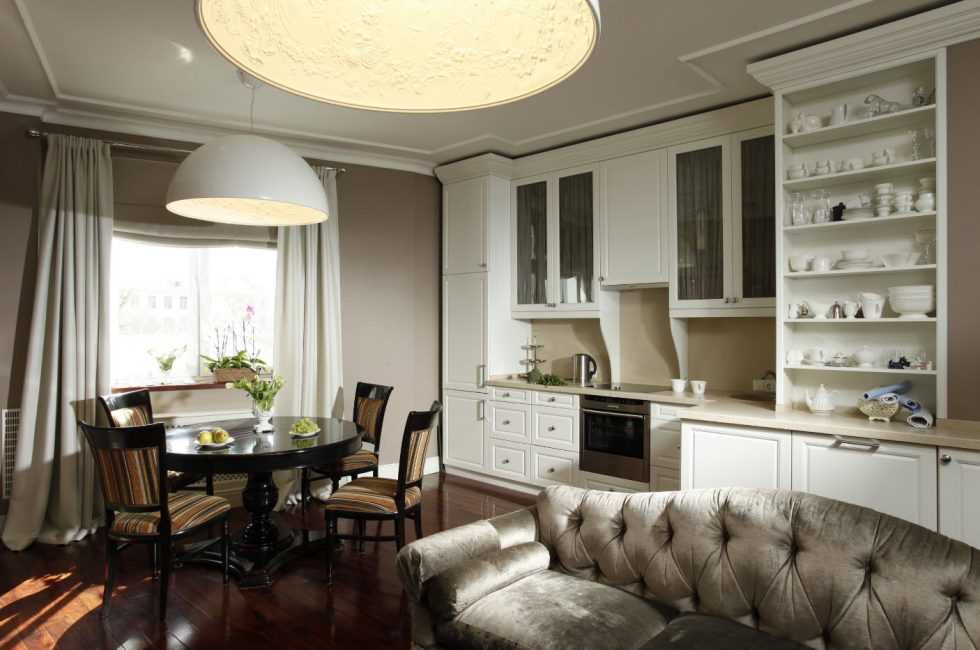 Для того чтобы иметь возможность поставить диван где угодно, даже по центру кухни, помещение должно быть просторным. Такой вариант подойдет для квартир-студий, в которых необходимо разграничить пространство и провести зонирование.