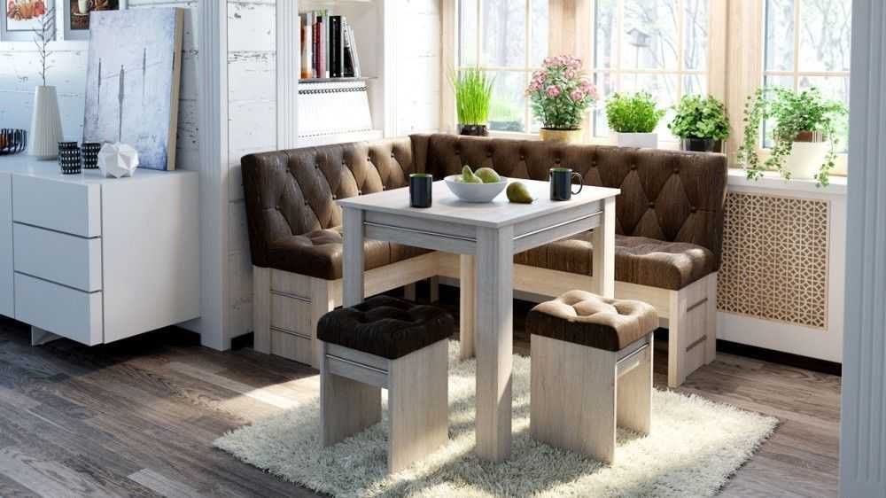 Кроме того, мебель в кухне гораздо больше подвержена загрязнению, нежели комнатная, а потому должна быть практичной и нетребовательной в уходе. По этой причине в качестве обивки используют экокожу, натуральную кожу и инновационные материалы, обладающие высокими показателями стойкости к загрязнениям и влажности.