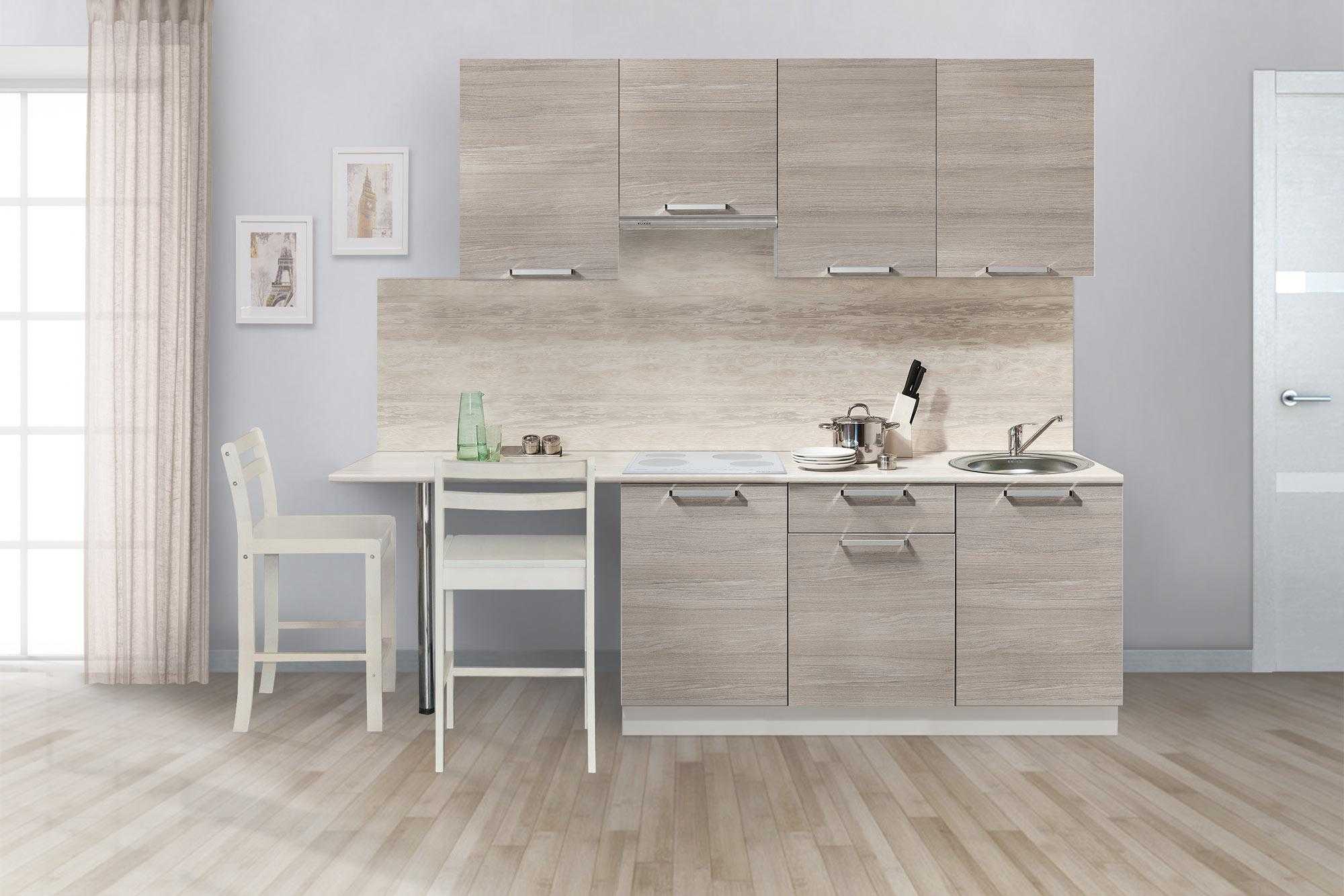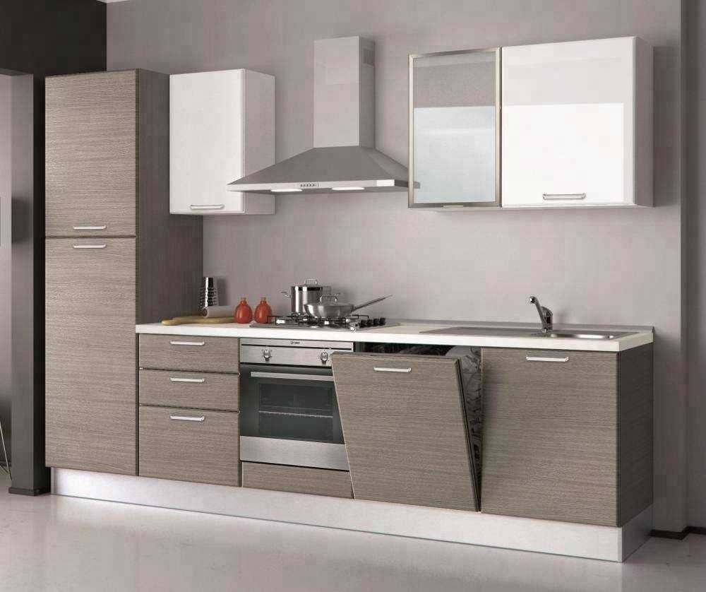 При расположении шкафов и бытовой техники на маленькой кухне в ряд, стоит соблюдать порядок: холодильник, раковина, плита. Расположение раковины посередине обеспечивает легкий доступ к воде во время первоначальной очистки продуктов и в момент приготовления. Вся бытовая техника на маленькой кухне должна быть отделена столешницей. Минимальная длина столешницы между холодильником и раковиной и с обеих сторон духовки составляет 40 см. На каждой маленькой кухне должна быть столешница длиной не менее 80 см. В прямой кухне обычно разделяется раковина и плита. На ограниченной площади плиту также можно разместить между холодильником и раковиной.