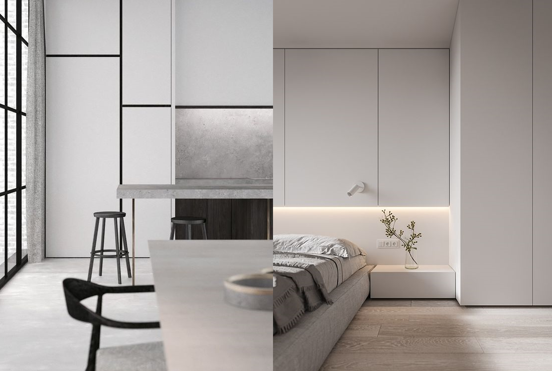 Это всё хорошо, но как быть, если вещей много, а места действительно мало? Минимализм и реальные бытовые сценарии в интерьере могут быть взаимоисключающими понятиями. Поддержать визуальный баланс на небольшом метраже помогут скрытые системы хранения, «замаскированные» под цвет стен. Фактически такие встроенные решения, конечно, «съедят» пространство, зато визуально его разгрузят и наведут порядок.
